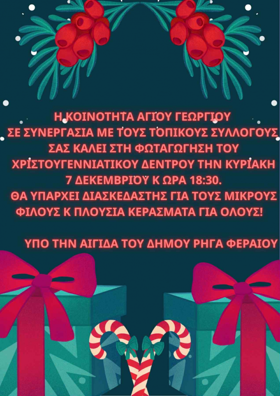 Η Τοπική Κοινότητα Αγίου Γεωργίου σε συνεργασία με τους τοπικούς συλλόγους σας καλεί στην φωταγώγηση του χριστουγεννιάτικου δέντρου, την Κυριακή 7 Δεκεμβρίου και ώρα 18:30.