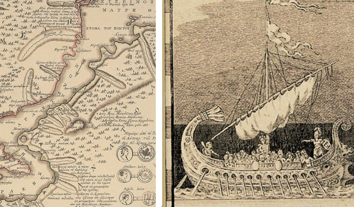 Γι’ αυτό, όταν σχεδίαζε την Χάρτα του και έγραφε τα βιβλία του σχετικές πληροφορίες περιλαμβάνει. Και πρώτα-πρώτα στον τίτλο της περίφημης Χάρτας του, κάτω αριστερά την Αργώ έχει βάλει με τον Ηρακλή και το ρόπαλό του, τον Ορφέα και τον αρχηγό Ιάσονα. Και στον «Νέον Ανάχαρσι» τον Άδμητο των Φερών τον μνημονεύει ως έναν από τους 55 Αργοναύτες, ενώ στην «Επιπεδογραφία της Κωνσταντινουπόλεως» δύο επεισόδια από την πορεία των Αργοναυτών στον Βόσπορο σημειώνει.