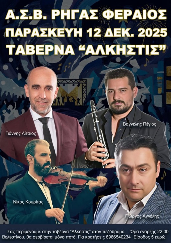 Την Παρασκευή 12 Δεκεμβρίου και ώρα 22:00 στην ταβέρνα “Άλκηστις” στον πεζόδρομο Βελεστίνου σας περιμένουμε για μια αξέχαστη βραδιά γεμάτη χορό, κέφι και ζωντανή μουσική από την εξαιρετική μας ορχήστρα!