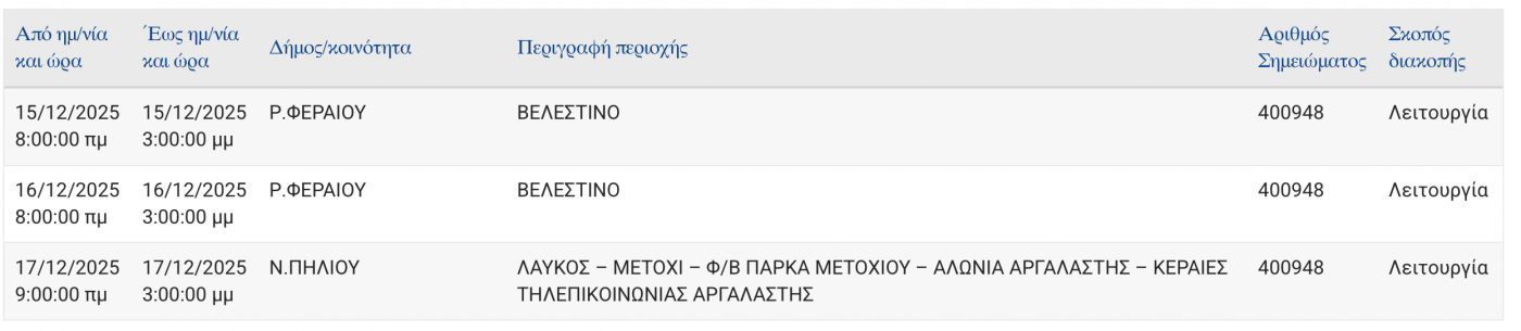 Παράλληλα, σε περιοχές της κωμόπολης πραγματοποιούνται εργασίες στο ηλεκτρικό δίκτυο αφού όπως είχε ανακοινωθεί, σήμερα Δευτέρα και αύριο Τρίτη από τις 8 το πρωί έως τις 3 το μεσημέρι θα υπάρχουν διακοπές ηλεκτροδότησης για λόγους λειτουργίας.
