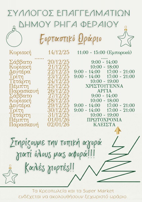 Με κεντρικό μήνυμα "Στηρίζουμε την τοπική αγορά γιατί όλους μας αφορά" ο Σύλλογος Επαγγελματιών Δήμου Ρήγα Φεραίου ανακοίνωσε το εορταστικό ωράριο λειτουργίας των καταστημάτων.