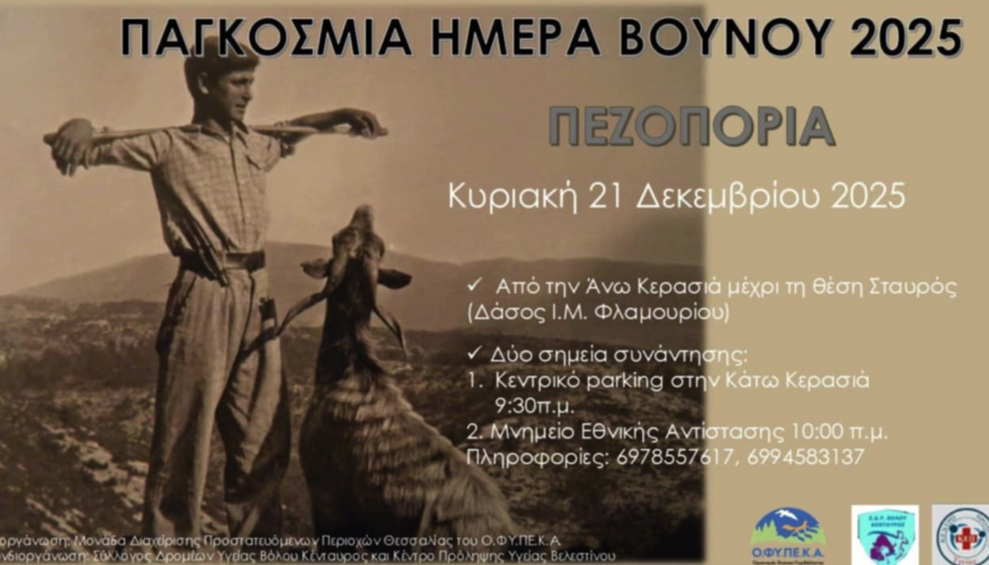 Την Κυριακή 21 Δεκεμβρίου, με αφορμή την Παγκόσμια Ημέρα Βουνού που προηγήθηκε, ο ΟΦΥΠΕΚΑ σε συνεργασία με τον ΣΔΥ Βόλου - Κένταυρος και το ΚΕΠ Υγείας Βελεστίνου διοργανώνουν πεζοπορία από την Άνω Κερασιά μέχρι τη θέση Σταυρός (Δάσος Ι.Μ. Φλαμουρίου).