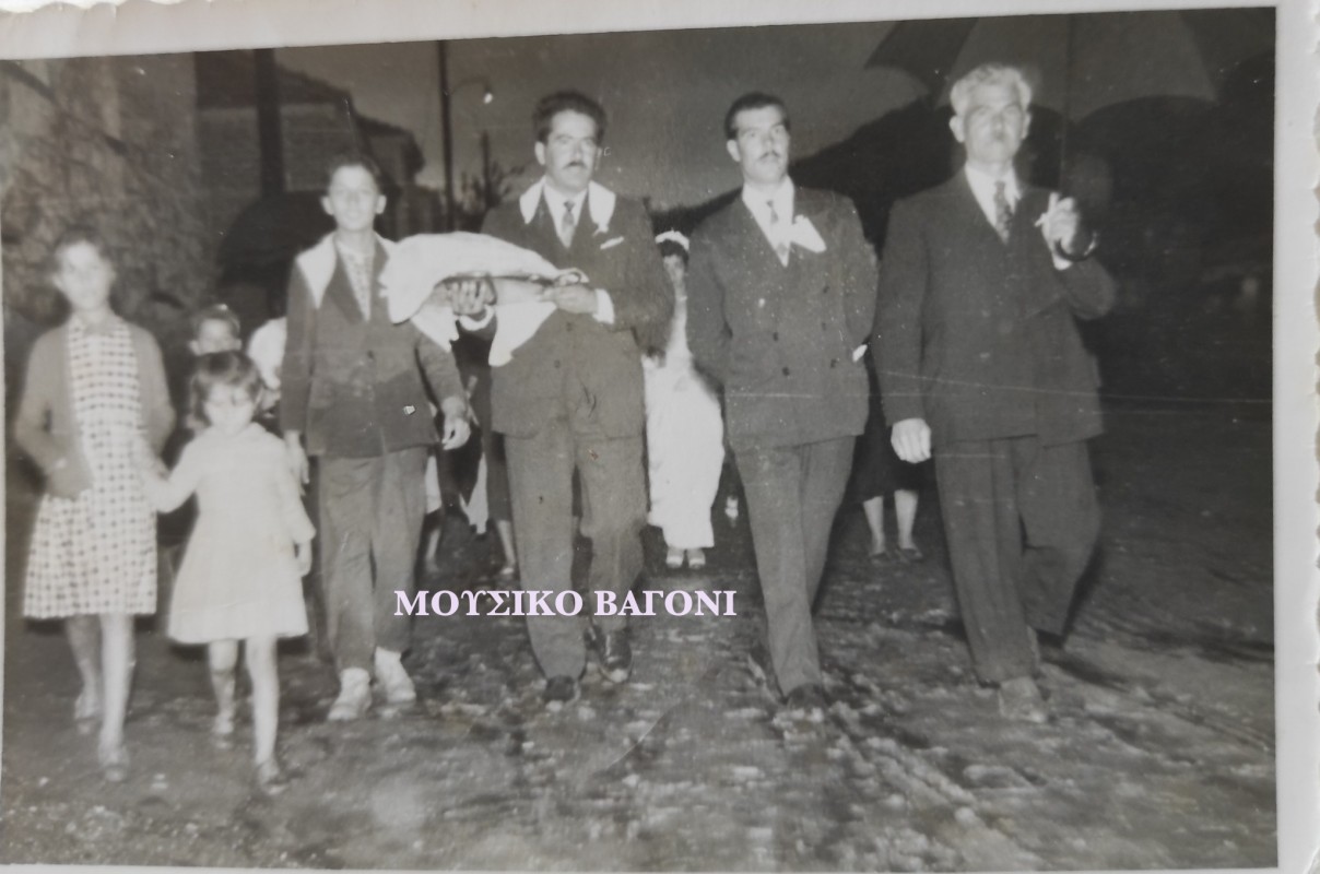 Όπως σημειώνει ο συνταξιούχος εκπαιδευτικός, Αντώνιος Φραγκούλης, από το αρχείο του οποίου προέρχεται η φωτογραφία, "εκείνα τα χρόνια πήγαιναν όλοι μαζί - και πεζοί στην εκκλησία. Και μετά το μυστήριο, ακολουθούσε χορός στο προαύλιο του Ναού.
