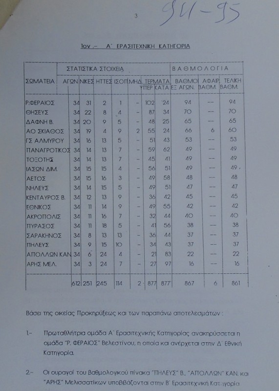 Η σεζόν 1994-1995 ήταν απόλυτα πετυχημένη για τον Ρήγα Φεραίο που κατέκτησε "αέρα" το πρωτάθλημα στην Α` Ερασιτεχνική κατηγορία κερδίζοντας την άνοδο στην Δ` Εθνική.