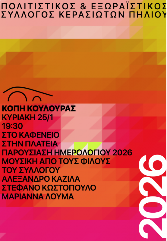 Ο Πολιτιστικός & Εξωραϊστικός Σύλλογος Κερασιωτών Πηλίου προσκαλεί όλους τους Κερασιώτες, τα μέλη και τους φίλους του χωριού στην πατροπαράδοτη κοπή της κουλούρας, η οποία θα πραγματοποιηθεί στο κοινοτικό κατάστημα στην Κερασιά την Κυριακή 25 Ιανουαρίου 2026 και ώρα 19:30.