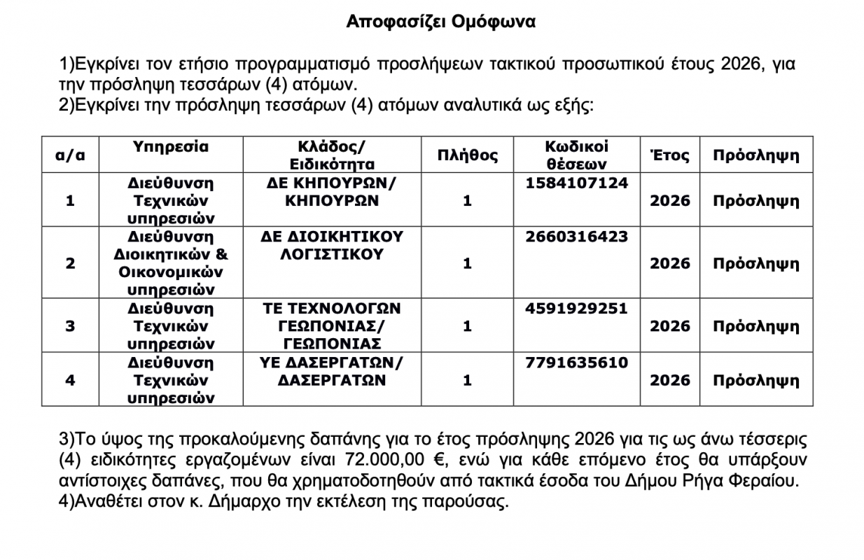 Λήψη απόφασης για την έγκριση του ετήσιου προγραμματισμού ανθρώπινου δυναμικού δημόσιας διοίκησης έτους 2026 - Πρόσληψη Τακτικού Προσωπικού Δήμου Ρήγα Φεραίου