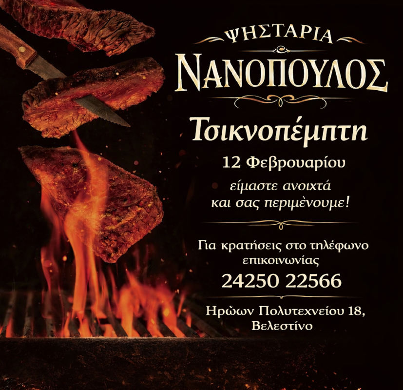 Την Τσικνοπέμπτη 12 Φεβρουαρίου η ψησταριά Νανόπουλος στο Βελεστίνο είναι έτοιμη να σας υποδεχθεί με πεντανόστιμο φαγητό και ξέφρενη διασκέδαση.