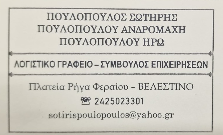 Για περισσότερες πληροφορίες σχετικά με τις αιτήσεις και τις προδιαγραφές του προγράμματος μπορείτε να απευθυνθείτε στο Λογιστικό Γραφείο αδερφών Πουλόπουλου στο Βελεστίνο.