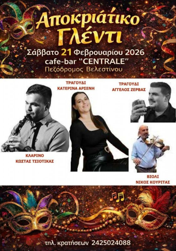 Ένα μεγάλο αποκριάτικο γλέντι έρχεται το Σάββατο 21 Φεβρουαρίου στο Cafe-Bar Centrale του Βελεστίνου!