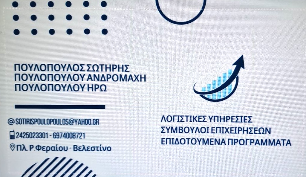 Για περισσότερες πληροφορίες σχετικά με τις αιτήσεις και τις προδιαγραφές του προγράμματος μπορείτε να απευθυνθείτε στο Λογιστικό Πουλόπουλου στο Βελεστίνο.