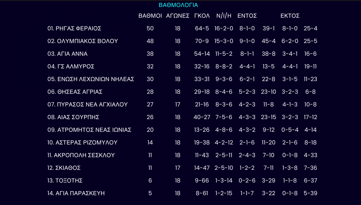 Με νίκες συνέχισαν Ρήγας Φεραίος και Ολυμπιακός Βόλου επικρατώντας εντός έδρας επί της Αγίας Παρασκευής (5-0) και του Ατρομήτου (3-0) αντίστοιχα. Ηττήθηκε με 1-3 από το Νηλέα στον Ριζόμυλο ο Αστέρας.
