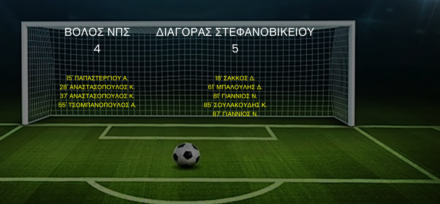Βόλος ΝΠΣ Β` - Διαγόρας Στεφανοβικείου 4-5 (15` Παπαστεργίου, 28`-37` Αναστασόπουλος, 55` Τσομπανόπουλος / 18` Σάκκος, 61` Μπαλουλης, 81`-87` Γιαννιός, 85` Σουλακούδης).
