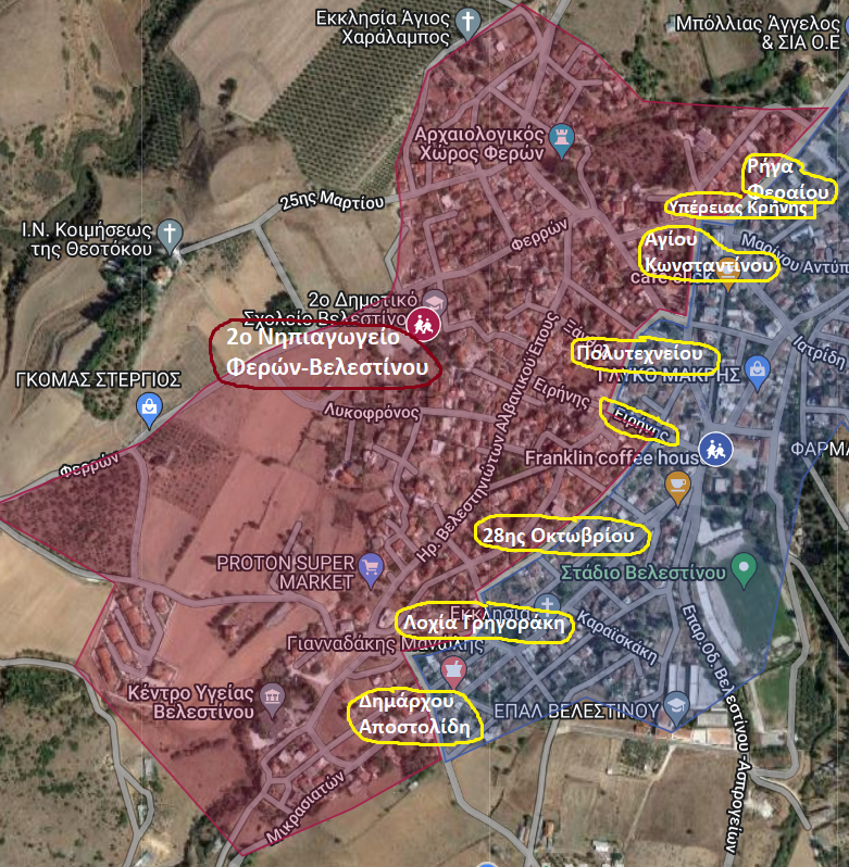 Τα όρια της σχολικής περιφέρειας του 2ου Νηπιαγωγείου Φερών-Βελεστίνου, καθορίστηκαν με άξονα-όριο τις οδούς: Ρήγα Φεραίου -Υπέρειας Κρήνης - Αγ. Κωνσταντίνου -Κων/νου Καραμανλή- Πολυτεχνείου - Ειρήνης – 28ης Οκτωβρίου - Ελ. Βενιζέλου - Λοχία Γρηγοράκη - Δημάρχου Αποστολίδη.