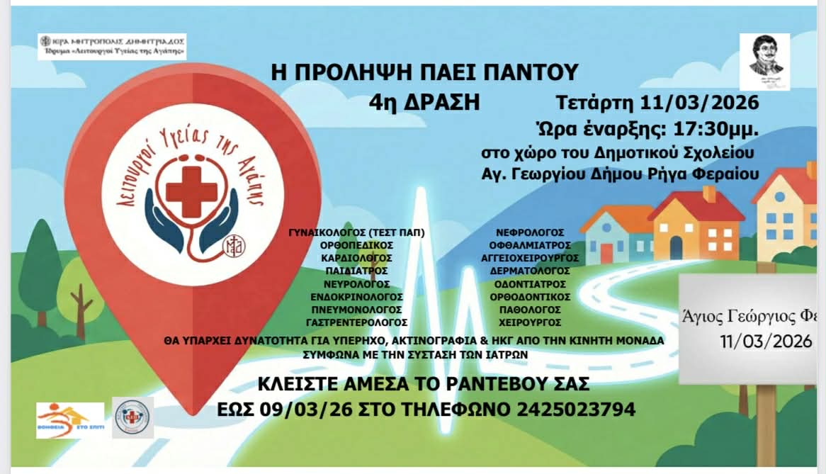 Ο Δήμος Ρήγα Φεραίου και το Ίδρυμα Λειτουργών Υγείας της Αγάπης της Ιεράς Μητρόπολης Δημητριάδος και Αλμυρού, σε συνεργασία με τον Ιατρικό, Φαρμακευτικό και Οδοντιατρικό Σύλλογο Ν. Μαγνησίας, διοργανώνουν δράση πρόληψης για την υγεία, με εθελοντική προσφορά ιατρών όλων των ειδικοτήτων, για δωρεάν εξέταση των κατοίκων του Αγίου Γεωργίου και της ευρύτερης περιοχής του Δήμου Ρήγα Φεραίου.