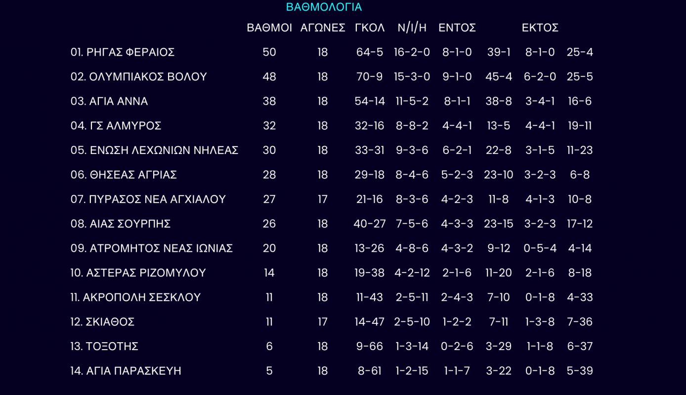 Με τον Θοδωρή Ανδρουτσόπουλο στον πάγκο και με στόχο να διατηρήσει τη διαφορά δύο βαθμών από τον Ολυμπιακό Βόλου, δύο αγωνιστικές πριν το μεταξύ τους παιχνίδι στο Βελεστίνο, ο πρωτοπόρος Ρήγας Φεραίος καλείται να υπερκεράσει το εμπόδιο της αξιόμαχης και φέτος Αγίας Άννας, με το παιχνίδι να ορίζεται το ερχόμενο Σάββατο στις 7 το απόγευμα στο γήπεδο της Αγριάς.