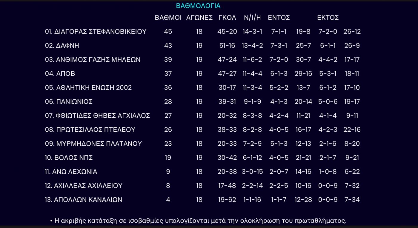 Με την ολοκλήρωση της 20ης αγωνιστικής η ομάδα του Στεφανοβικείου φιγουράρει μόνη πρώτη στην βαθμολογία της Β` ΕΠΣΘ.