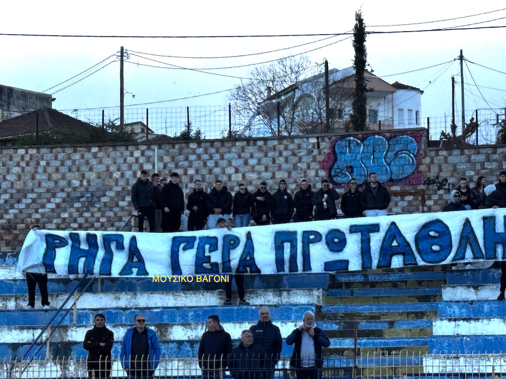 Μάλιστα, σηκώθηκε και το χαρακτηριστικό πανό που έγραφε "Ρήγα Γερά Πρωτάθλημα Ξανά - Θύρα 2".