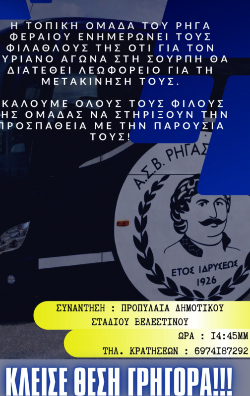 Ναυλώνει λεωφορείο για τους φιλάθλους ο Ρήγας