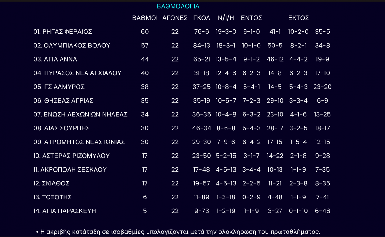 Μετά το ισόπαλο (1-1) του πρωτοπόρου Ρήγα απέναντι στον Αίαντα, ο Ολυμπιακός Βόλου, που απέδρασε με δραματικό τρόπο από το Σέσκλο, μείωσε την διαφορά στους τρεις βαθμούς με τους Κυανόλευκους ωστόσο να διατηρούν το πλεονέκτημα και σε περίπτωση ισοβαθμίας.