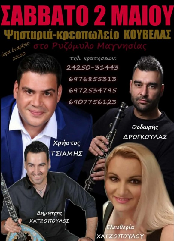 Το Σάββατο 2 Μαΐου, στο πανηγύρι του Αγίου Αθανασίου, η ψησταριά Κουβελάς στον Ριζόμυλο Μαγνησίας διοργανώνει μεγάλη λαϊκοδημοτική βραδιά και είστε όλοι καλεσμένοι!