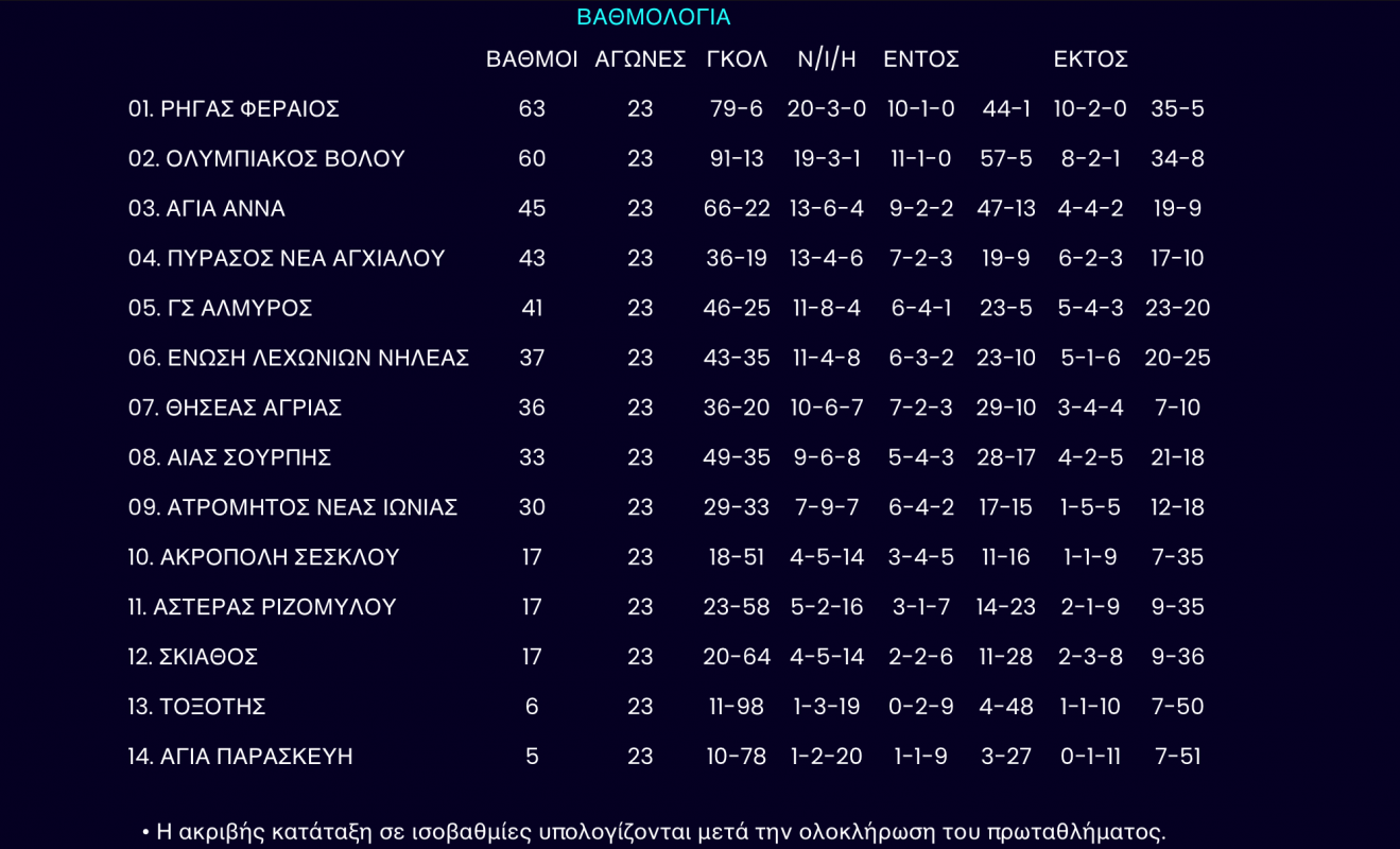 Την πρώτη από τις δύο νίκες που χρειάζεται στις τρεις τελευταίες αγωνιστικές για να εξασφαλίσει και μαθηματικά τον τίτλο του πρωταθλητή θέλει απέναντι στον ήδη υποβιβασμένο Τοξότη ο Ρήγας Φεραίος, με το παιχνίδι να διεξάγεται το πρωί της Κυριακής (26/4 - 11 π.μ.) στο βοηθητικό του ΕΑΚ Βόλου.