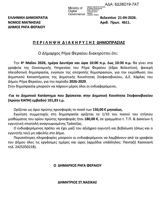 Την Δευτέρα 4 Μαΐου θα πραγματοποιηθεί στα γραφεία της οικονομικής υπηρεσίας του Δήμου Ρήγα Φεραίου φανερή πλειοδοτική δημοπρασία για την εκμίσθωση του δημοτικού καταστήματος στο Στεφανοβίκειο που αφορά την περίοδο 2026-2029.