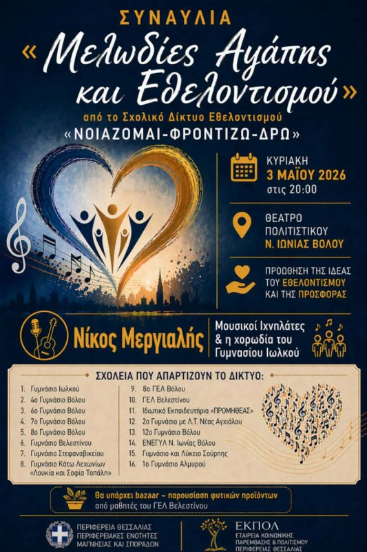Το Σχολικό Δίκτυο Εθελοντισμού " Νοιάζομαι -Φροντιζω-Δρω" που απαρτίζεται από 16 σχολεία του Νομού Μαγνησίας διοργανώνει συναυλία " ΜΕΛΩΔΙΕς ΑΓΑΠΗΣΗ ΚΑΙ ΕΘΕΛΟΝΤΙΣΜΟΥ".
